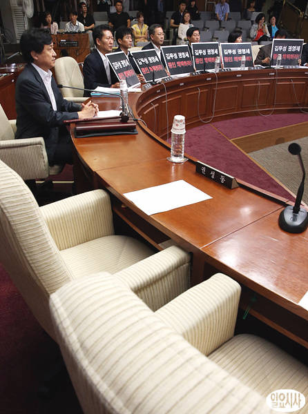 21일 오전 국회에서 열린 국가정보원 댓글 의혹 사건 등의 진상규명을 위한 국정조사특별위원회 청문회가 열린 가운데, 야당 의원들이 김무성, 권영세 증인 채택을 촉구하는 내용의 팻말을 들고 자리에 앉아 있는 반면, 새누리당 권성동 간사 등 여당 의원들의 자리는 텅텅 비어 있다.