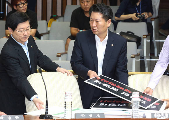 21일 오전 국회에서 열린 국가정보원 댓글 의혹 사건 등의 진상규명을 위한 국정조사특별위원회 청문회에서 정청래 간사와 박범계 의원이 김무성, 권영세 증인 채택을 촉구하는 내용의 팻말을 들고 자리에 앉고 있다.