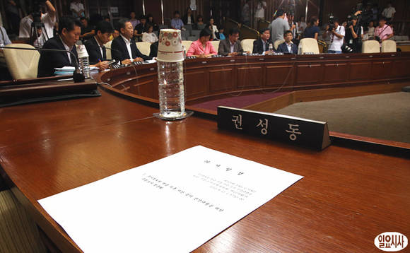 21일 오전 국회에서 열린 국가정보원 댓글 의혹 사건 등의 진상규명을 위한 국정조사특별위원회 청문회가 열린 가운데, 권성동 새누리당 간사 책상 위에 의사일정표만 덩그러니 놓여져 있다.