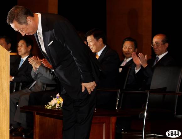 박용만 신임 대한상공회의소 회장이 21일 오후 서울 중구 남대문로 대한상공회의소에서 열린 취임식에서 허리 숙여 인사하고 있다.