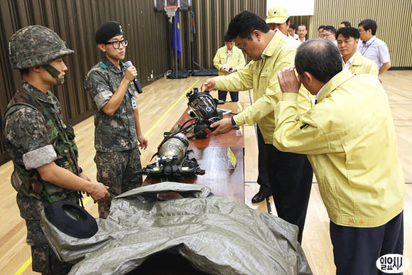 민방위 훈련이 실시된 21일 오후, 국회에서 정진석 사무총장이 비상시 사용되는 장비 시연회에 참석해 방독면을 만져보고 있다.