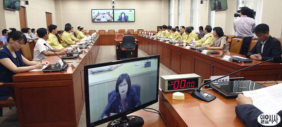 국회 기획재정위원회와 정부세종청사 간 화상회의 운용 시연회가 21일 오후 국회 기획재정위 회의실에서 열리고 있다.