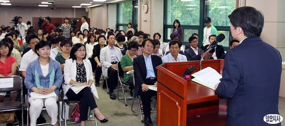 안철수 무소속 의원이 21일 오후 서울시의회 별관에서 열린 국가와 지방정부의 합리적인 보육재정 분담 방안 모색을 위한 토론회에 참석해 축사를 하고 있다.