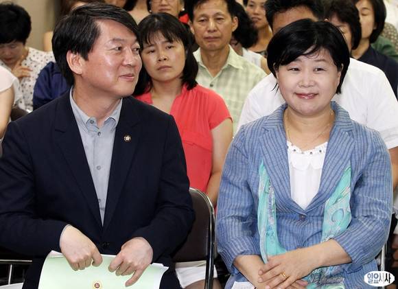 안철수 무소속 의원(왼쪽)이 21일 오후 서울시의회 별관에서 열린 국가와 지방정부의 합리적인 보육재정 분담 방안 모색을 위한 토론회에 참석해 서영교 민주당 의원을 바라보며 미소 짓고 있다.