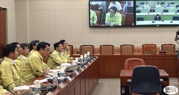 국회 기획재정위원회와 정부세종청사 간 화상회의 운용 시연회가 21일 오후 국회 기획재정위 회의실에서 열린 가운데, 정진석 국회 사무총장이 인사말을 하고 있다.