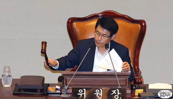 이군현 국회 예산결산특별위원회 위원장이 21일 오후 열린 전체회의에서 의사봉을 두드리고 있다.