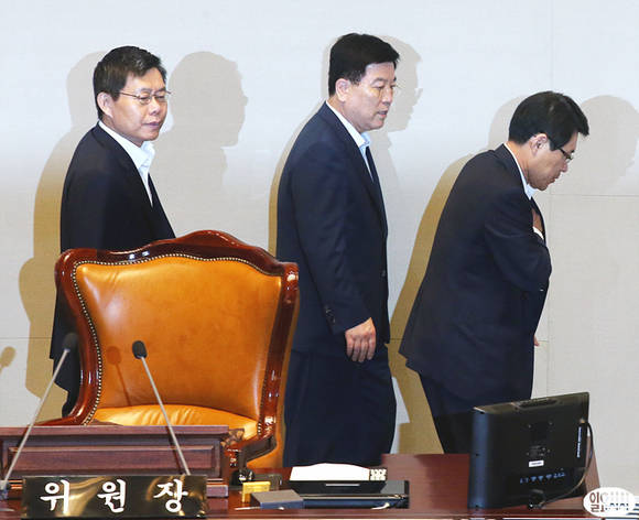 이군현 국회 예산결산특별위원회 위원장(오른쪽부터), 김광림 새누리당 간사, 최재천 민주당 간사가 21일 오후 전체회의가 끝난 후 결산심사소위원회 구성안을 논의하기 위해 함께 회의장을 나서고 있다.