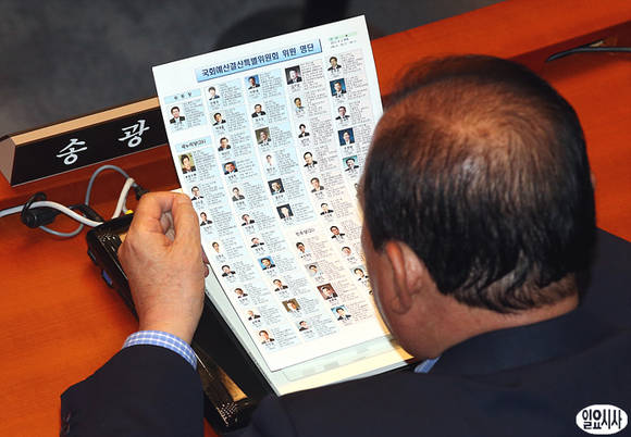 국회 예산결산특별위원회 송광호 새누리당 의원이 21일 오후, 전체회의 도중 특위 위원들의 명단을 확인하고 있다.