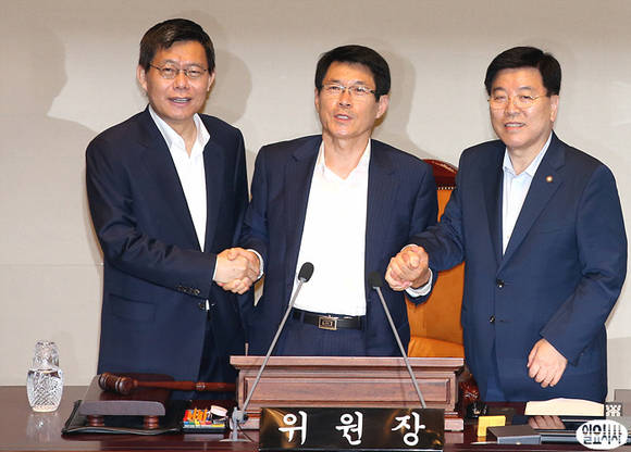 국회 예산결산특별위원회 이군현 위원장(사진 가운데), 김광림 새누리당 간사(오른쪽)와 최재천 민주당 간사가 21일 오후 전체회의 종료 직후 손을 맞잡고 있다.