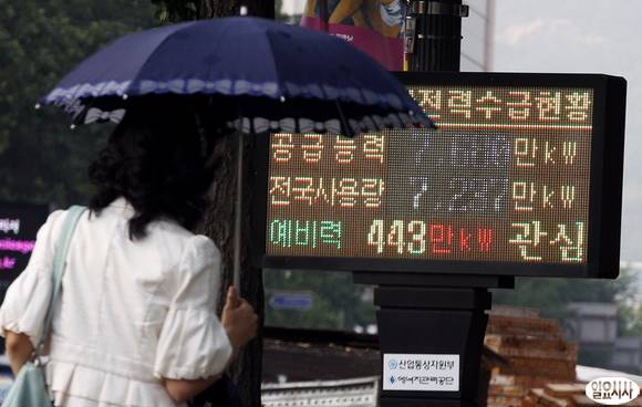 100만kW급의 한빛 원전 6호기의 가동 중단으로 전력수급경보 '관심' 단계가 발령된 21일 오후 서울 지하철 시청역에 인근에 설치된 전광판이 현재 전력수습 상황을 표시하고 있다.