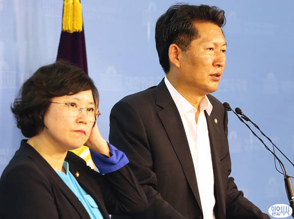 국조특위 야당 정청래 야당 간사와 민주당 김현 의원이 22일 오후, 국회 정론관에서 청와대 재방문 국정원 댓글의혹 사건에 대한 박근혜 대통령의 책임을 촉구하는 공개서한 결과를 발표하고 있다.