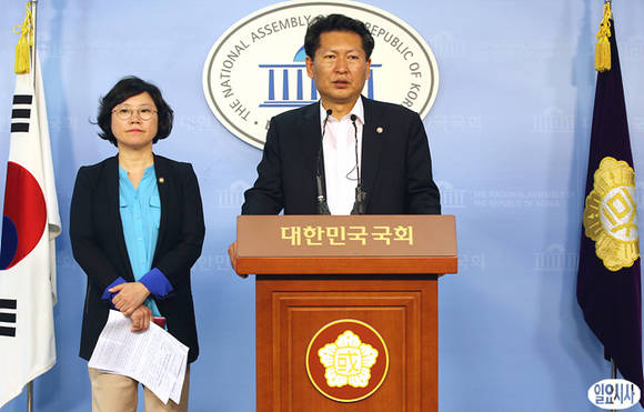 국조특위 야당 정청래 야당 간사(사진 오른쪽)와 민주당 김현 의원이 22일 오후, 국회 정론관에서 청와대 재방문 국정원 댓글의혹 사건에 대한 박근혜 대통령의 책임을 촉구하는 공개서한 결과를 발표하고 있다.