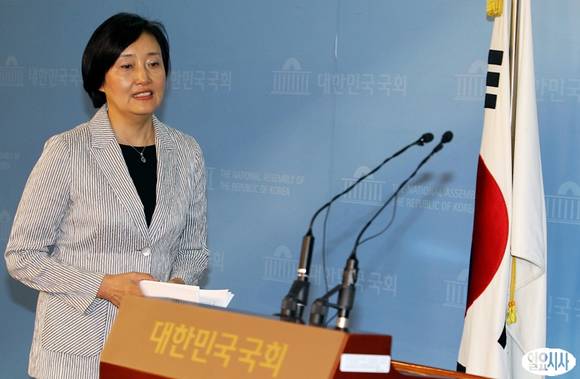 박영선 민주당 의원이 23일 서울 여의도 국회 정론관에서 '국정원개혁 패키지 4법' 입법 추진과 관련한 기자회견을 갖기 위해 입장하고 있다.