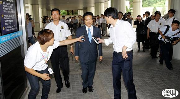 정치·선거에 개입한 혐의(공직선거법 위반) 등으로 기소된 김용판 전 서울지방경찰청장이 23일 오후 첫 공판을 받기 위해 서울 서초동 서울중앙지법에 출석, 취재진의 질문을 받고 있다.