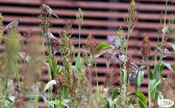 여름 더위가 가시고 가을을 맞는 처서인 23일 서울 종로구 세운초록띠공원 수수밭에서 참새들이 먹이를 쪼고 있다.