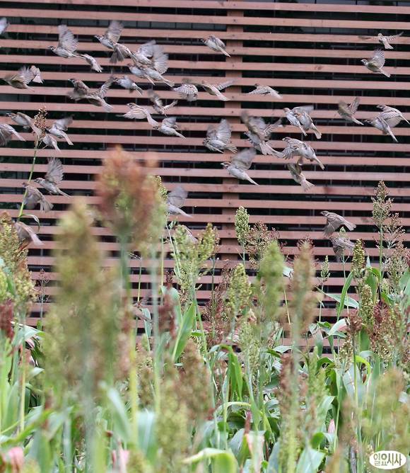 여름 더위가 가시고 가을을 맞는 처서인 23일 서울 종로구 세운초록띠공원 수수밭에서 참새들이 인기척에 놀라 하늘로 날아오르고 있다.
