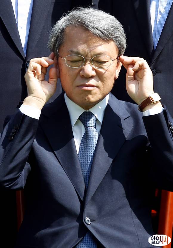 지난 23일 전격 사퇴한 양건 감사원장이 26일 오전 서울 종로구 삼청동 감사원에서 이임식을 마친 뒤 기념촬영을 하는 도중 안경을 매만지고 있다.