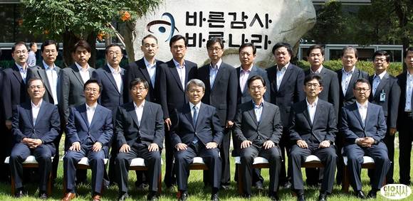 지난 23일 전격 사퇴한 양건 감사원장(앞줄 왼쪽에서 네번째)이 26일 오전 서울 종로구 삼청동 감사원에서 이임식을 마친 뒤 기념촬영을 하고 있다.