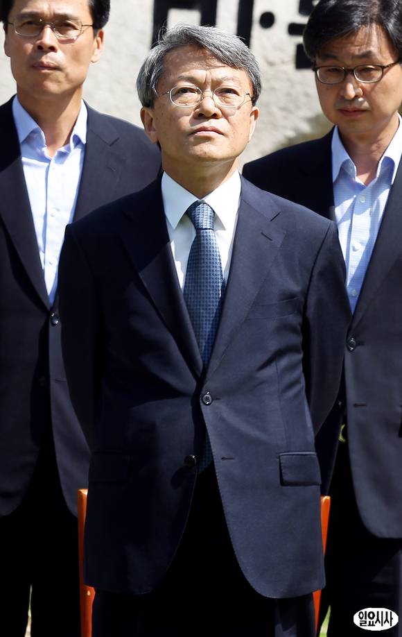 지난 23일 전격 사퇴한 양건 감사원장이 26일 오전 서울 종로구 삼청동 감사원에서 이임식을 마친 뒤 기념촬영을 하는 도중 하늘을 바라보고 있다.