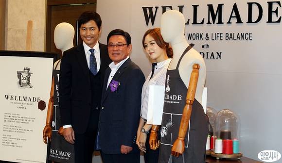 26일 오전 서울 중구 플라자호텔에서 열린 세정그룹 통합 유통 브랜드 '웰메이드' 론칭 행사에서 박순호 회장과 홍보모델 정우성, 성유리가 포즈를 취하고 있다.