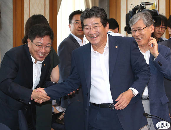 [포토] "정치는 즐거워" 악수 나누는 윤상직-강석호