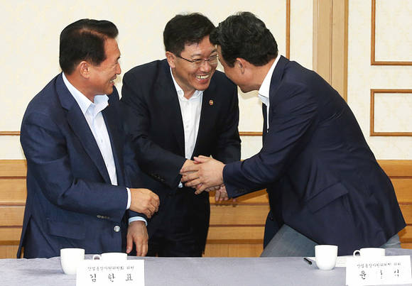 윤상직 산업통상자원부 장관(사진 가운데)이 26일 오후, 국회 귀빈식당에서 열린 새누리당 제4정조위 및 국회 산업통상자원위원회 관계자들과의 악수를 나누고 있다.