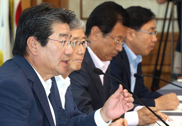 강석호 새누리당 제4정조위원장(사진 왼쪽)이 26일 오후 국회 귀빈식당에서 열린 산업통상자원부와의 당정 협의에서 인사말을 하고 있다.