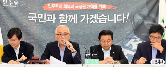 김한길 민주당 대표가 26일 서울 시청광장 앞 천막당사에서 열린 최고위원회의에서 모두발언을 하고 있다.