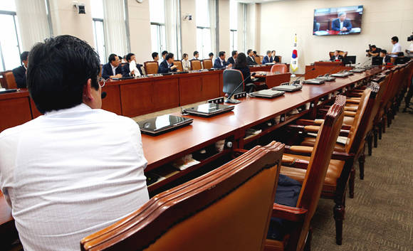 여야는 26일, 전년도 결산안 심의를 위해 농림수산식품해양수산위원회를 비롯한 4개 상임위 전체회의를 열었으나 장외투쟁 중인 민주당 불참으로 각 상임위 회의마다 정상적으로 진행되지 못하고 파행을 겪었다. 사진은 이날 오후 야당 의원들이 불참한 가운데 열린 산업통상자원위 전체회의장 모습.