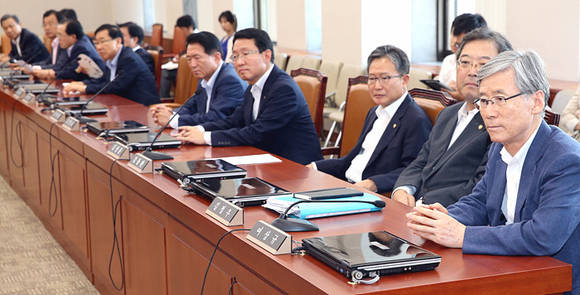 여야는 26일, 전년도 결산안 심의를 위해 농림수산식품해양수산위원회를 비롯한 4개 상임위 전체회의를 열었으나 장외투쟁 중인 민주당 불참으로 각 상임위 회의마다 정상적으로 진행되지 못하고 파행을 겪고 있는 가운데, 이날 오후 여당 산자위원들이 불편한 표정으로 앉아 있다.