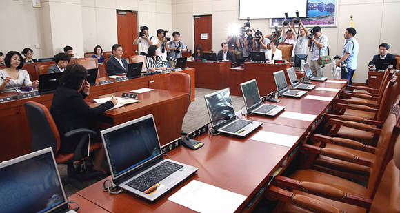 26일 오전, 국회 여성가족위 김상희 위원장이 야당 여성가족위원들이 참석하지 않은 상태에서 개회를 알리는 의사봉을 두드리고 있다.