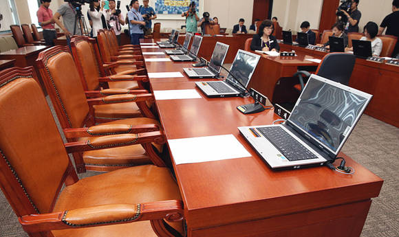 26일 오전, 국회 여성가족위원실에서 전체회의가 열린 가운데, 민주당 등 야당 여가위원석이 일제히 텅 비어 있다.