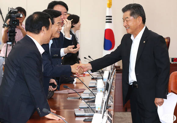 국회 교육문화체육관광위원회가 27일 오전, 개의되었으나 10분만에 야당의원들의 불참으로 파행을 겪은 가운데 신학용 위원장(사진 오른쪽)과 새누리당 서상기 의원이 즐거운 표정으로 웃으며 악수를 나누고 있다.