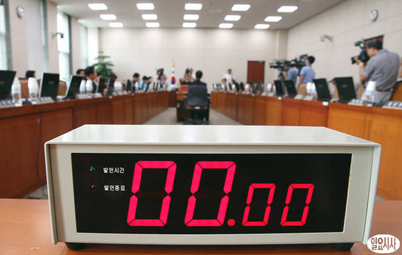 국회 교육문화체육관광위원회가 27일 오전, 개의되었으나 10분만에 야당의원들의 불참으로 파행을 겪고 있는 가운데 발언 타이머 계수기가 멈춰져 있다.