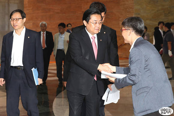 전병헌 민주당 원내대표(사진 가운데)가 4일 오전, 이날 오후에 처리가 예상되는 통합진보당 이석기 의원에 대한 체포동의안과 관련한 의원총회 참석을 위해 입장하던 도중 통진당 이상규 의원(사진 오른쪽)과 악수를 나누고 있다.