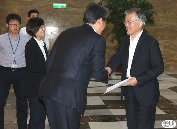 민주당 문재인 의원(사진 오른쪽)이 4일 오후, 처리가 예상되는 통합진보당 이석기 의원에 대한 체포동의안과 관련한 의원총회 참석을 위해 입장하던 도중 통진당 김선동 의원과 로텐더홀에서 악수를 나누고 있다.