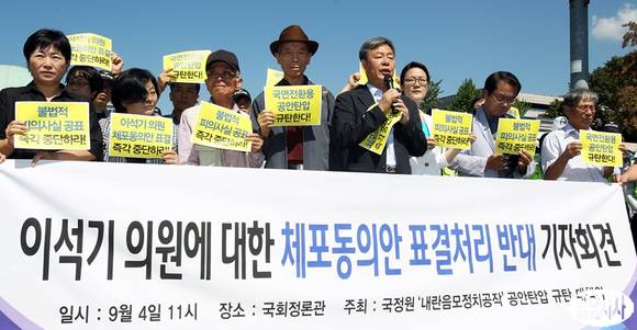 이석기 통합진보당 의원에 대한 체포동의안이 국회 본회의에서 표결 예정된 4일 서울 여의도 국회 앞에서 국정원 내란음모정치공작 공안탄압 규탄 대책위가 이 의원에 대한 체포동의안 표결처리 반대 기자회견을 하고 있다.