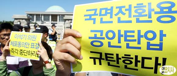 이석기 통합진보당 의원에 대한 체포동의안이 국회 본회의에서 표결 예정된 4일 서울 여의도 국회 앞에서 국정원 내란음모정치공작 공안탄압 규탄 대책위가 이 의원에 대한 체포동의안 표결 처리 반대 기자회견을 하고 있다.
