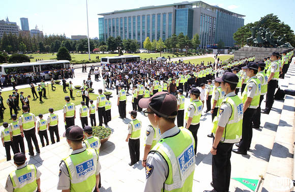 4일 오전, 서울 여의도 국회의사당 본청 계단에 경찰들이 통합진보당원들과 지지자들의 국회 진입을 물샐 틈 없이 막고 있다.