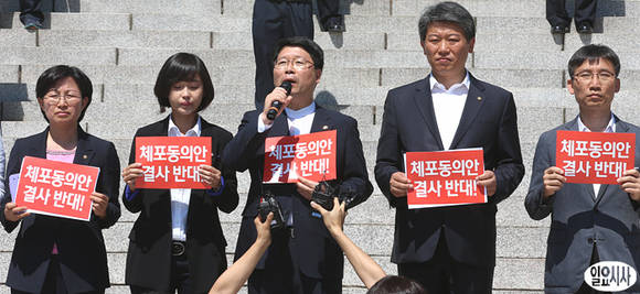 오병윤 통합진보당 원내대표(가운데)와 김재연(사진 왼쪽), 김선동 의원 등이 4일 오전 서울 여의도 국회의사당 정문에서 열린 이석기 의원 체포동의안 처리 반대 기자회견을 갖고 있다.