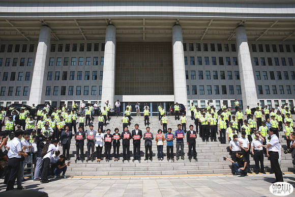 오병윤 통합진보당 원내대표, 김재연, 김선동 의원 등이 4일 오전, 서울 여의도 국회의사당 본청 계단에서 피켓을 든 채로 이석기 의원 체포동의안 처리 반대 퍼포먼스를 하고 있다.