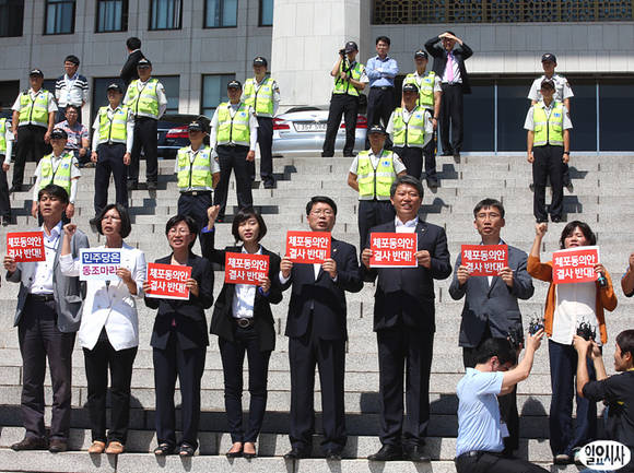 4일 오전 서울 여의도 국회의사당 정문에서 열린 이석기 의원 체포동의안 처리 반대 기자회견에서 참석자들이 구호를 외치고 있다.