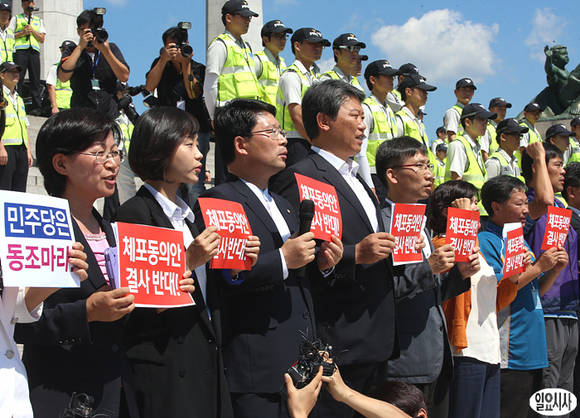 4일 오전 서울 여의도 국회의사당 본청 계단서 열린 이석기 의원 체포동의안 처리 반대 기자회견에서 통진당 의원 및 당직자 및 지지자들이 구호를 외치고 있다.