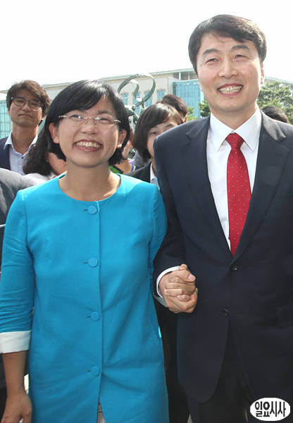 4일 오후, 국회 본회의장에서 열린 통진당 이석기 의원(사진 오른쪽)에 대한 체포동의안이 가결처리된 후 이 의원이 국회 본청으로 나와 통진당 이정희 대표와 활짝 웃고 있다.