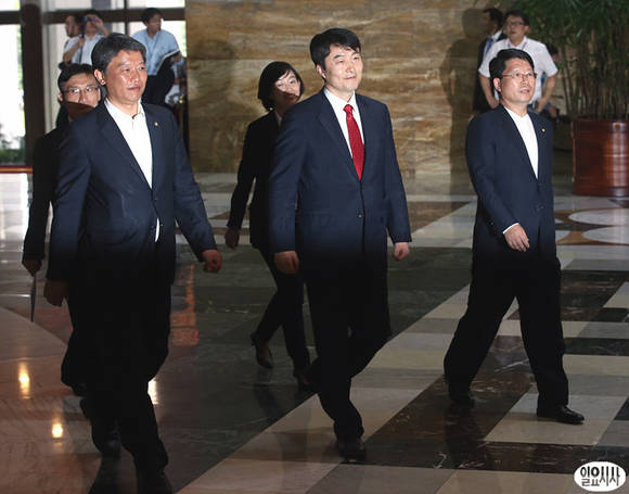 4일 오후, 국회 본회의장에서 통진당 이석기 의원(사진 가운데)에 대한 체포동의안이 가결처리된 후 이 의원이 오병윤 원내대표(사진 오른쪽)와 김선동 의원과 함께 국회 로텐더홀을 지나 본청으로 향하고 있다.