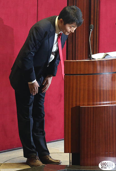 4일 오후, 국회 본회의장에서 열린 통진당 이석기 의원에 대한 체포동의안 표결 직전, 이 의원이 신상발언을 앞두고 인사하고 있다.
