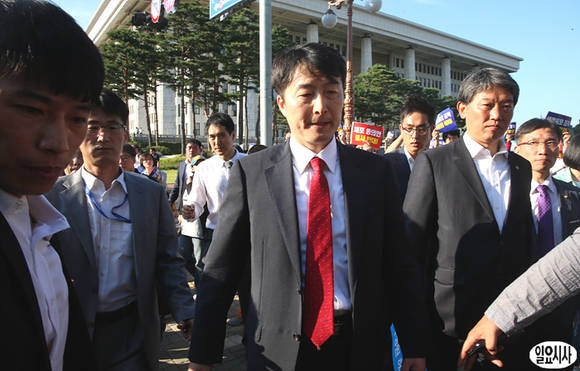 4일 오후, 국회 본회의장에서 열린 통합진보당 이석기 의원에 대한 체포동의안이 가결처리된 후 이 의원이 같은 당 김선동 의원 등과 함께 어두운 표정으로 이동하고 있다.