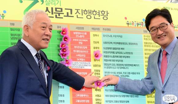 민주당 김한길 대표(왼쪽)와 우원식 최고위원이 6일 서울 시청광장 앞 천막당사에서 열린 최고위원회의에서 '을 살리기 신문고' 진행 현황판에 꽃을 달고 있다.
