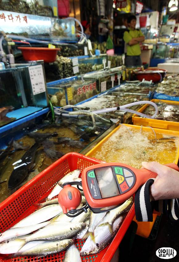 정부가 6일 당정협의를 거쳐 일본 후쿠시마 인근 8개 현에서 생산된 수산물에 대해 전면 수입금지 조치를 내렸다. 사진은 이날 노량진 수산시장에서 관계자가 수산물에 대해 방사능 검사를 하고 있는 모습.