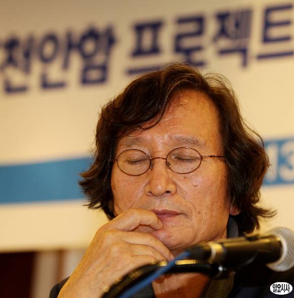 9일 오전 서울 중구 프레스센터에서 열린 영화 '천안함 프로젝트' 상영 중단에 대한 영화인들의 긴급 기자회견에서 제작자인 정지영 감독이 눈을 감고 생각에 잠겨 있다.